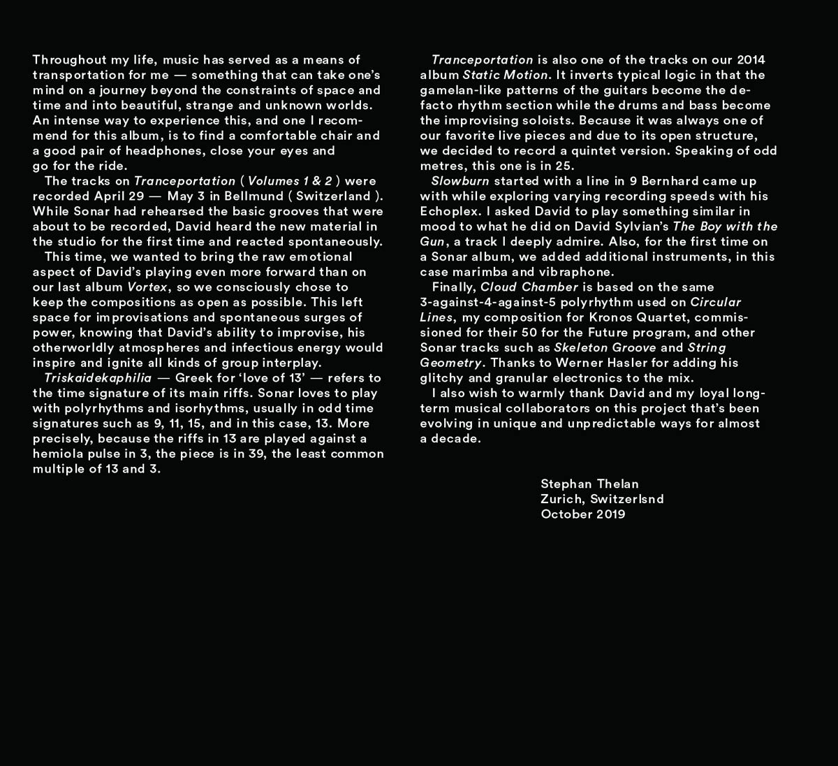 As with 2018’s Vortex, and last year’s Tranceportation Volume 1, the regular quartet of Stephan Thelen (tritone guitar), Bernard Wagner (tritone guitar), Christian Kuntner (tritone bass), Manuel Pasquinelli (drums, percussion) are joined by Grammy-nominated guitarist David Torn.